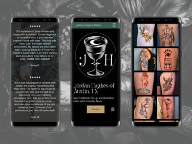 I developed this website to showcase Jordan Hughes’s tattoo artistry in Austin, TX. The design embraces bold, expressive visuals with a clean layout, vivid imagery of finished tattoos, and a welcoming, inclusive tone tailored for his diverse clientele.