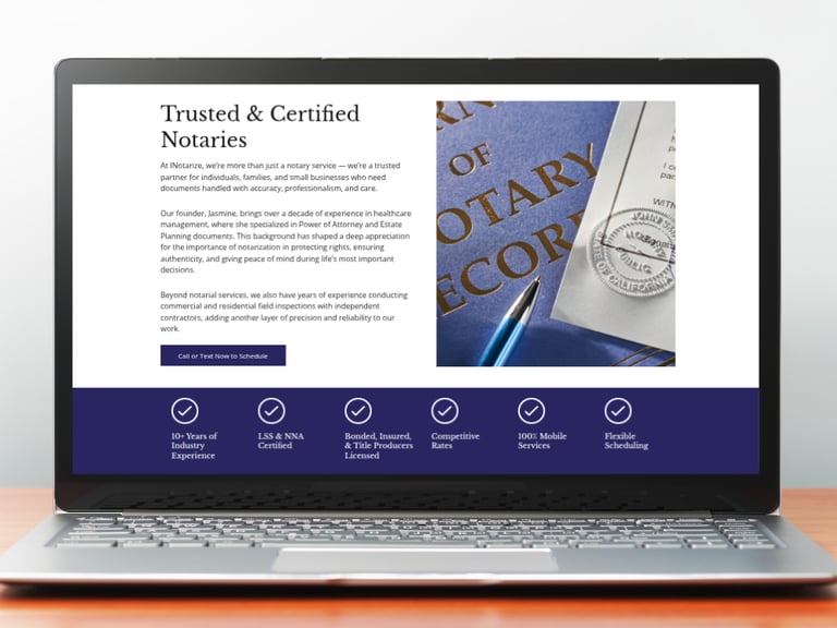 This website showcases INotarize’s mobile notary service, a professional, fast-moving business based in Indianapolis offering same-day appointments, document signings and real-estate closings. The site reflects this with a clean, trust-inspiring layout, bold calls-to-action such as “Call or Text Now to Schedule”, and clear service‐area coverage.